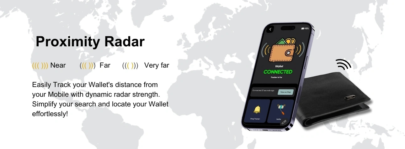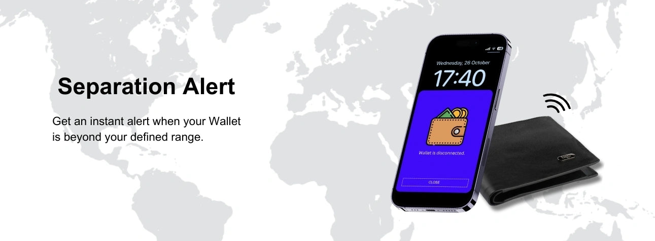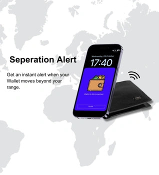 - तुमचे हरवलेले वॉलेट सहज शोधा - त्याच्या अँटी-लॉस्ट स्मार्ट ब्लूटूथ ट्रॅकरसह, तुम्ही तुमचे हरवलेले वॉलेट त्वरीत शोधण्यात सक्षम व्हाल. फक्त हे सुरक्षित वॉलेट तुमच्या Android किंवा Apple डिव्हाइससोबत ब्लूटूथद्वारे पेअर करा. तुमची पर्स रेंजच्या बाहेर गेल्यावर सेपरेशन अलार्म तुम्हाला सूचित करतो.