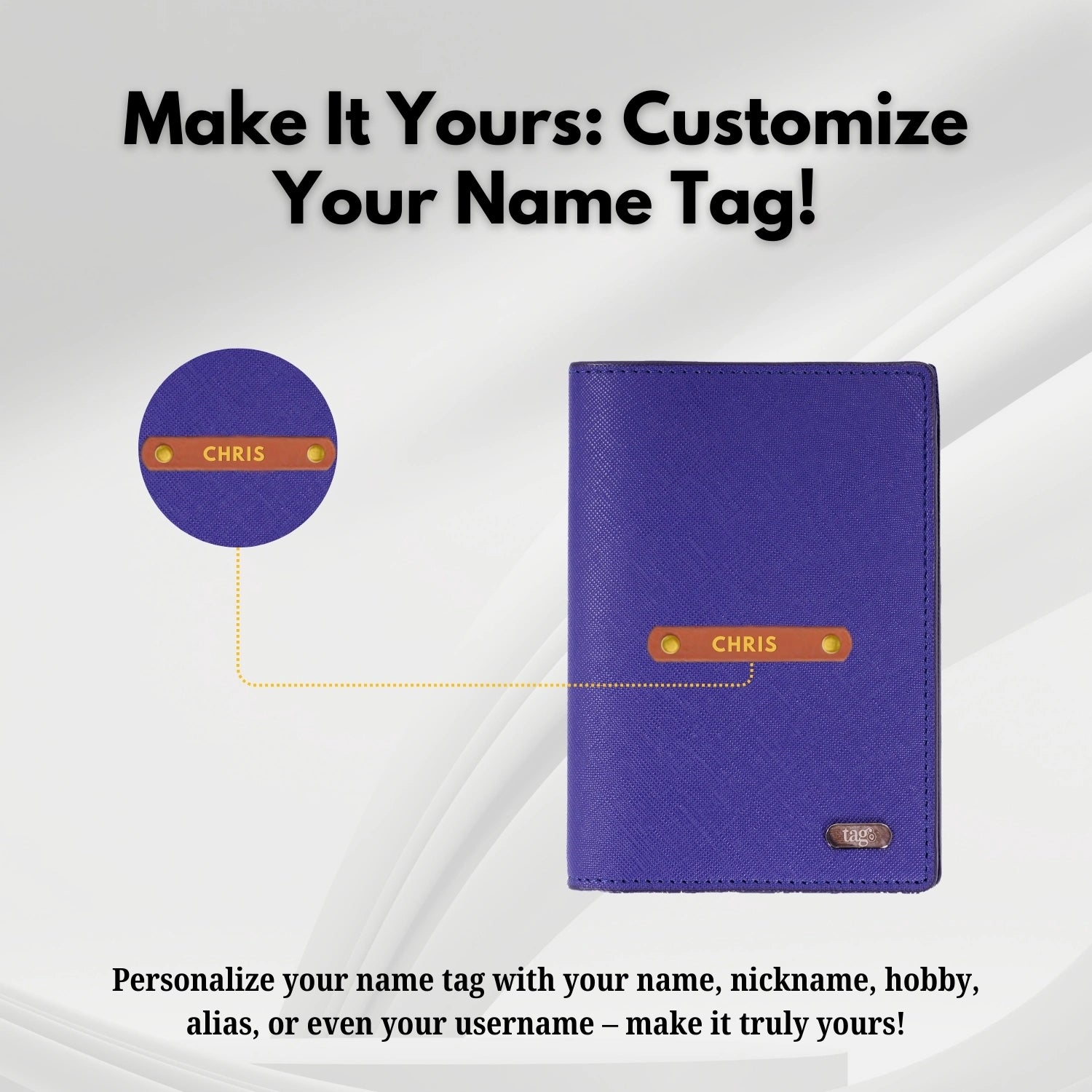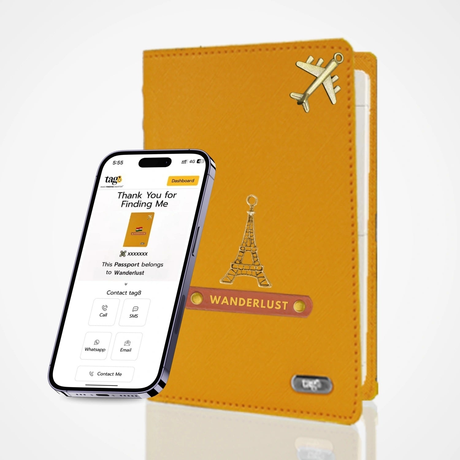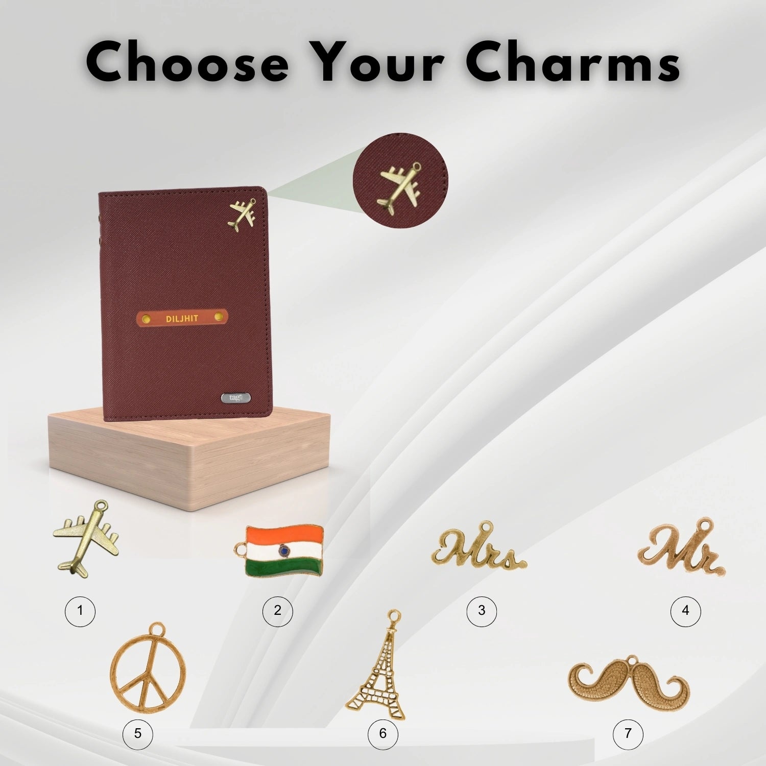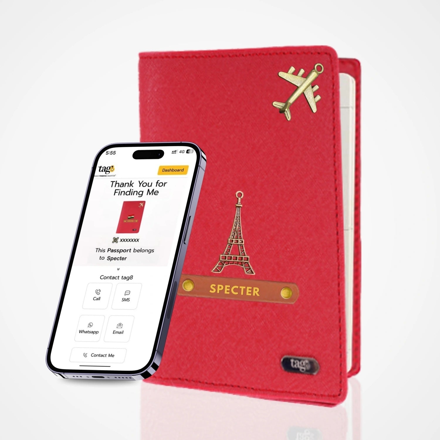 tag8 Personalised Name & Charm Leather RFID Passport Cover Holder with Bluetooth Based GPS Tracking, Separation Alert, Android & iOS Compatible, Customised