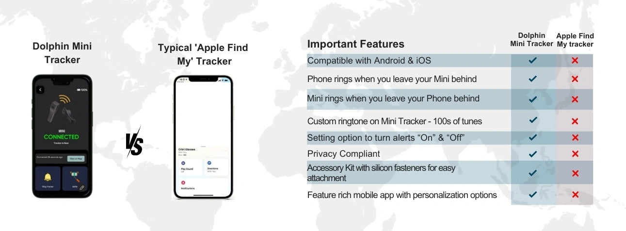 - [வரம்பு & கண்காணிப்பு] டால்பின் மினி iOS இல் வெளிப்புறங்களில் 100+ அடிக்கும், உட்புறங்களில் சுமார் 30+ அடிக்கும் இடையில் இயங்கும். இதன் பீப் ஒலி 85+ db வரை இருக்கும். வரம்பிற்குள் இருக்கும்போது, நீங்கள் டால்பின் டிராக்கர் செயலியைப் பயன்படுத்தி உங்கள் கண்ணாடிகளை ரிங் செய்யலாம். வரம்பிற்கு வெளியே இருக்கும்போது, மற்ற டால்பின் டிராக்கர் செயலி பயனர்கள் டால்பின் ஃபைண்டர் நெட்வொர்க்கில் அதைக் கண்டறிய உங்களுக்கு உதவுவார்கள். கடைசியாகப் பார்த்த வரைபட இருப்பிடத்தையும் நீங்கள் சரிபார்க்கலாம்.