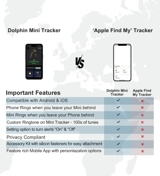 - [இணைக்க எளிதானது] டால்பின் மினி iOS மற்றும் Android சாதனங்களுடன் தடையின்றி செயல்படுகிறது. இணைப்பது எளிது: டால்பின் டிராக்கர் செயலியைப் பதிவிறக்கி, செயலியைத் திறந்து, உள்நுழைந்து, புதிய டிராக்கரை '+சேர்' செய்து, 7-10 வினாடிகள் காத்திருந்து, ஒரு பெயரையும் படத்தையும் தேர்வு செய்யவும், பின்னர் இணைப்பு நிறைவடையும். இது ஒரு நிமிடத்திற்கும் குறைவாகவே ஆகும்.