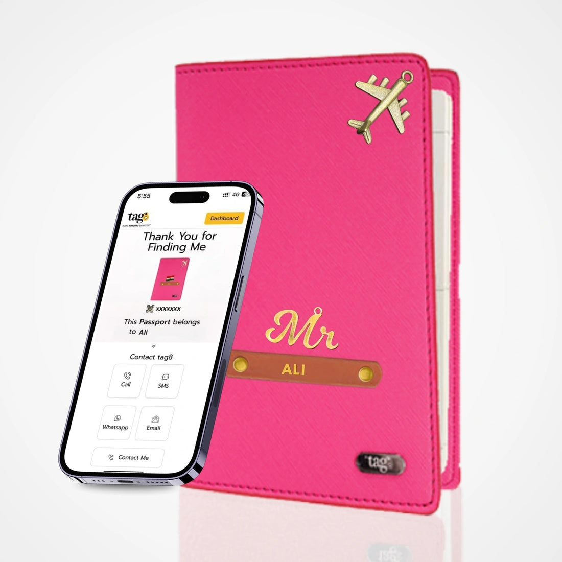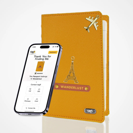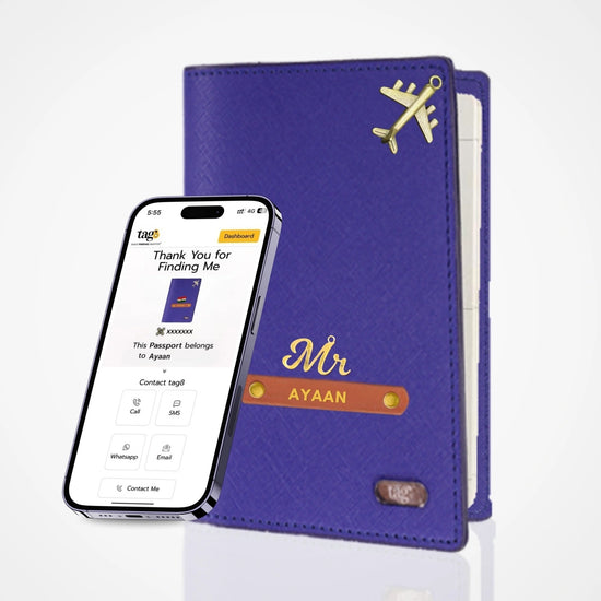 tag8 தனிப்பயனாக்கப்பட்ட பெயர் & வசீகரமான தோல் RFID பாஸ்போர்ட் கவர் ஹோல்டர், புளூடூத் அடிப்படையிலான GPS கண்காணிப்பு, பிரிப்பு எச்சரிக்கை, Android & iOS இணக்கமானது, தனிப்பயனாக்கப்பட்டது