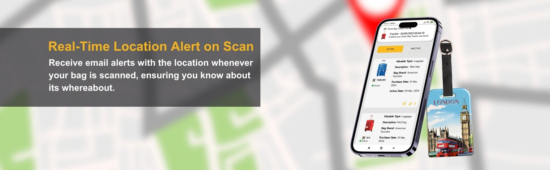 - [தவறாக வைக்கப்பட்டுள்ள பைகள் பற்றிய உடனடி எச்சரிக்கைகள்] ஃபைண்டர் மூலம் உங்கள் பை ஸ்கேன் செய்யப்பட்டவுடன் அதன் இருப்பிடத்துடன் நிகழ்நேர மின்னஞ்சல் விழிப்பூட்டல்களைப் பெறுங்கள், இதன் மூலம் விமான நிலைய அமைப்புகளுக்குள் அல்லது வெளியே அது எங்குள்ளது என்பதை நீங்கள் எப்போதும் அறிந்துகொள்ளலாம்.